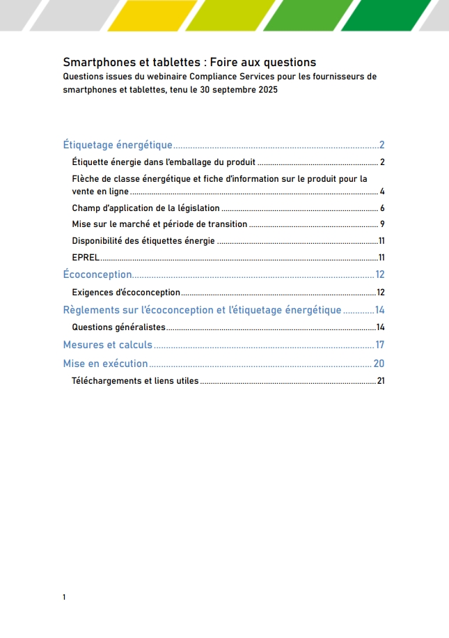 Les exigences en matière d'écoconception des smartphones, téléphones mobiles, téléphones sans fil et tablettes entrent en vigueur le 20 juin 2025. Les exigences en matière d'étiquetage énergétique entrent en vigueur à la même date, mais uniquement pour les smartphones et tablettes.